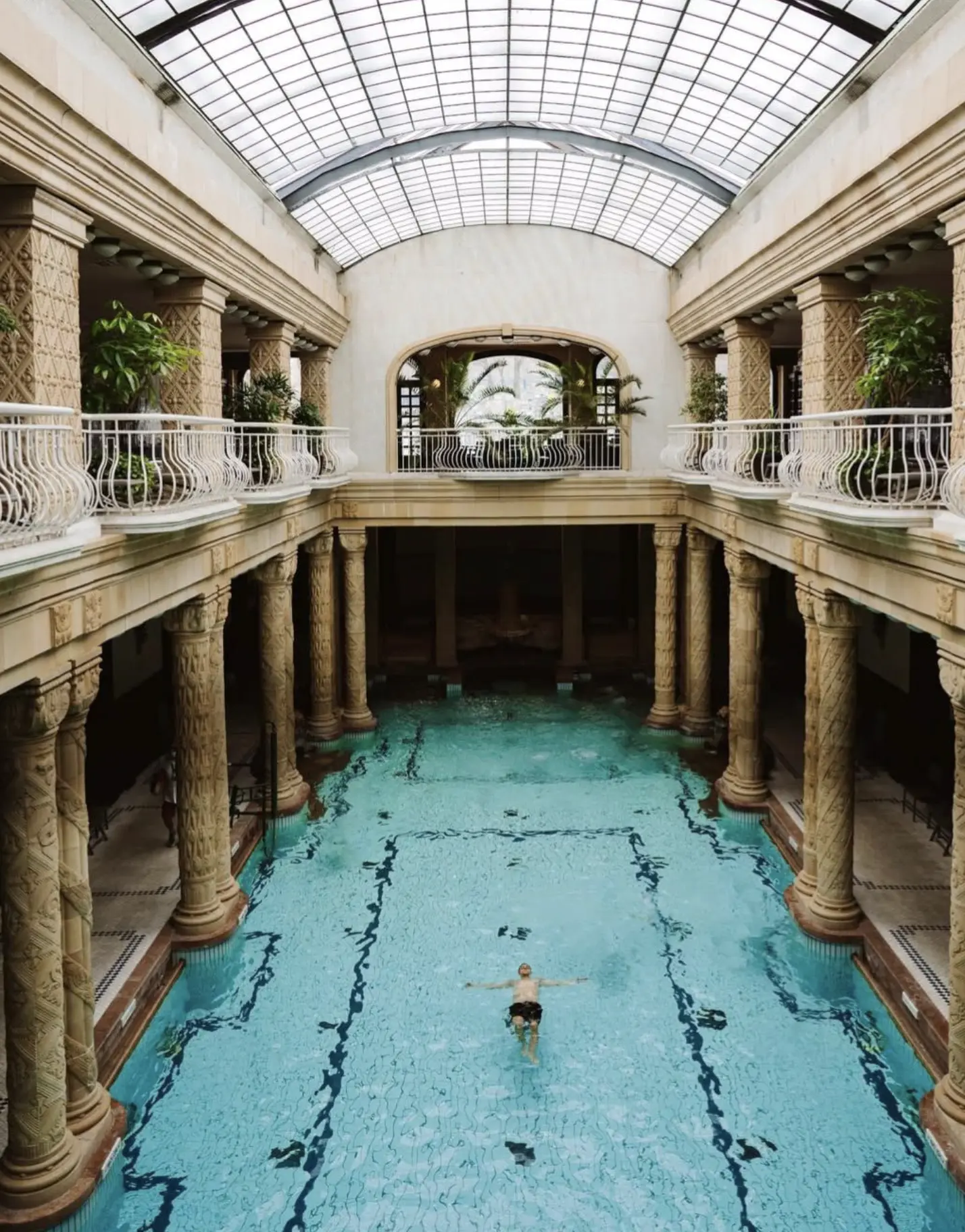 Turkish steam bath (hamam), sauna, cold plunge pools, and family bathing sections.